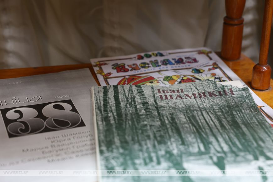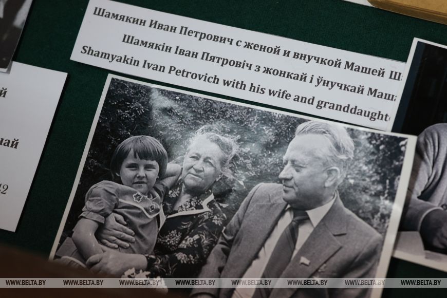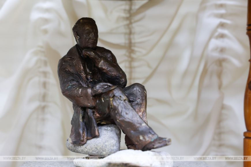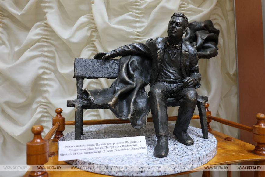 Позади стола находятся макеты памятников Ивану Шамякину. В деревне Корма перед библиотекой имени писателя стоит его бюст, а в сентябре 2025 года в Добруше установили памятник Ивану Петровичу.