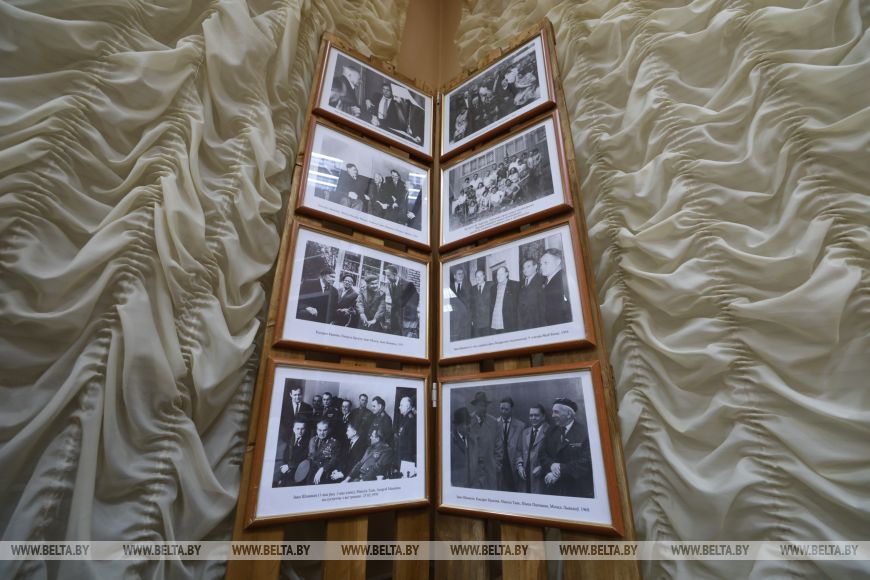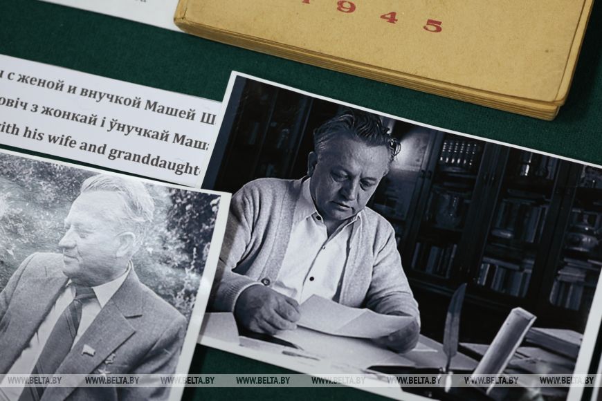 На противоположной стороне стола находится коллекция фотографий писателя. В экспозицию музея их передали родственники, а фотографии последних лет жизни предоставила газета "Гомельская правда". На них запечатлены семья писателя, его молодость, служба в армии, встречи с другими знаменитыми писателями эпохи.
